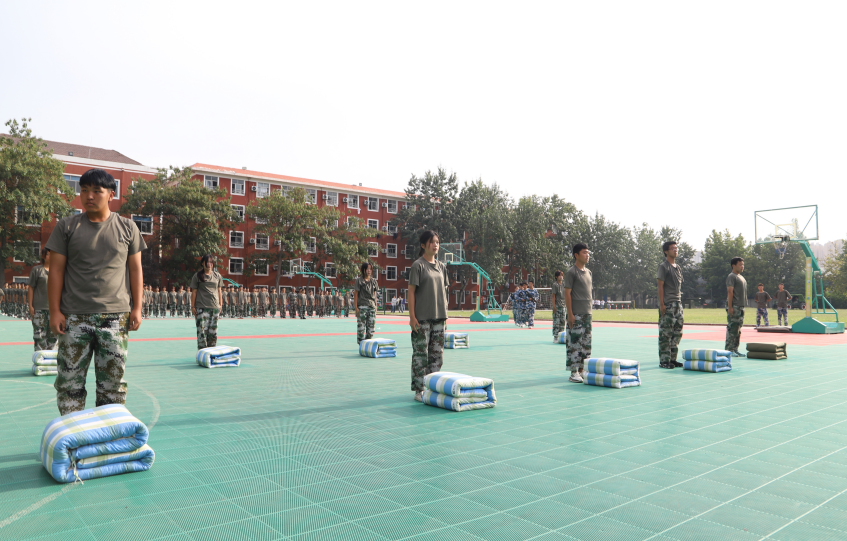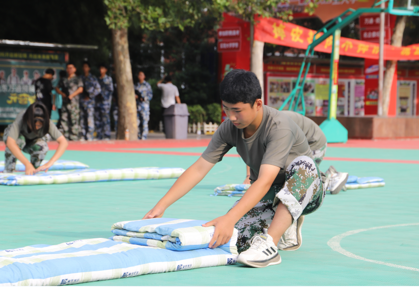 内务整理表演,同学们熟练轻快地将被子舒展铺开,用力将被子压平,对称叠齐,捏出棱角,再细致地整理被子厚度和平整被面。