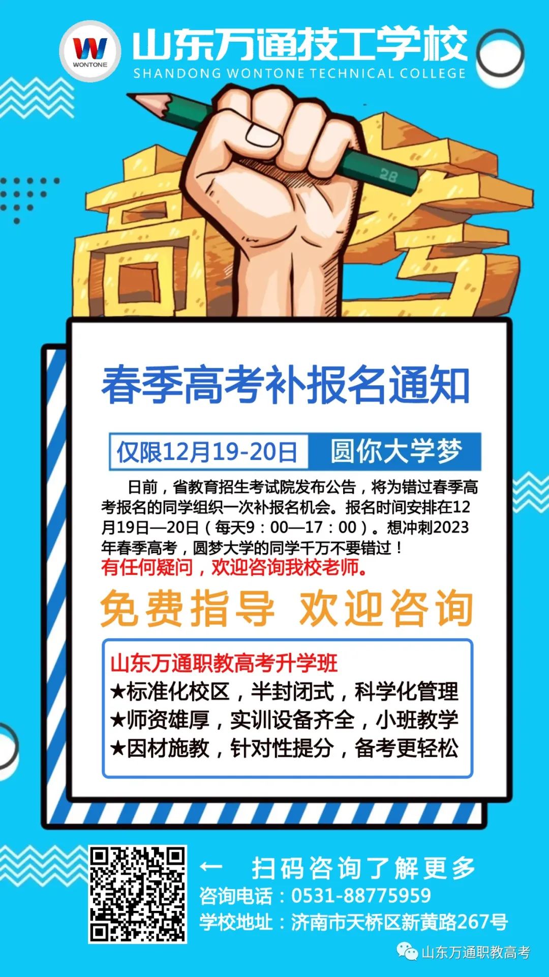 日前山东省教育招生考试院发布公告。公告说明:研究决定,为部分错过2023年普通高等学校招生考试报名(以下简称高考报名)的考生提供一次补报名机会。也就是说,错过了2023年春季报名的同学们可以不用再等一年,有一次补报名机会!如果你不知道怎么报名,没有关系,直接保存下面这张海报,长按联系我们,我校资深老师将为同学们免费指导。