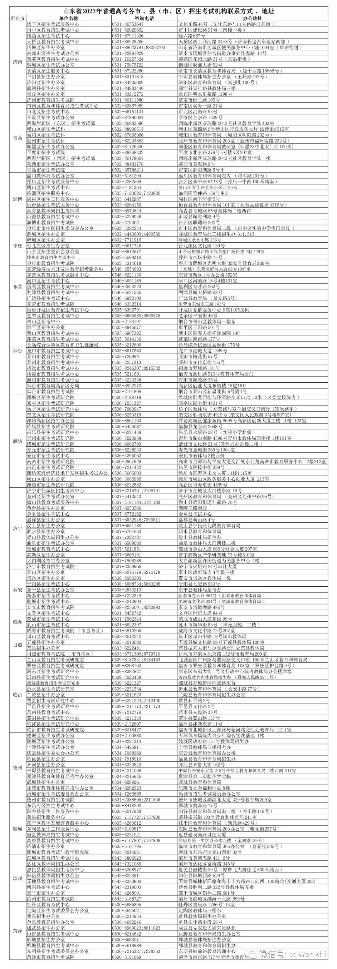 2023年高考各市县地址及联系方式